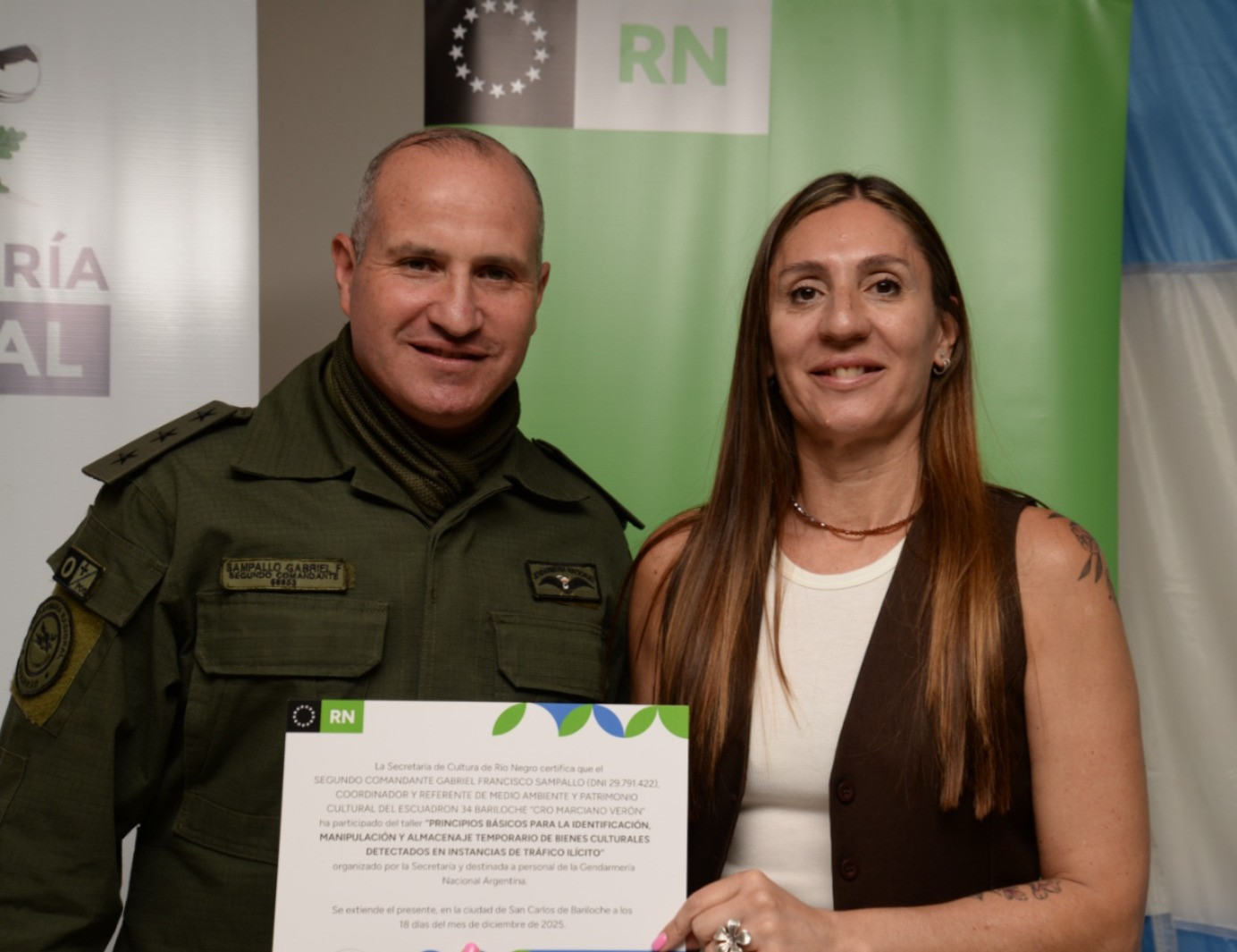 Durante el encuentro que se desarrolló en el Escuadrón 34 de Bariloche, se abordó la protección de los bienes culturales en la provincia, el marco legal internacional, nacional y provincial, los permisos de investigación y las cadenas de custodia y nociones básicas de arqueología y paleontología.
