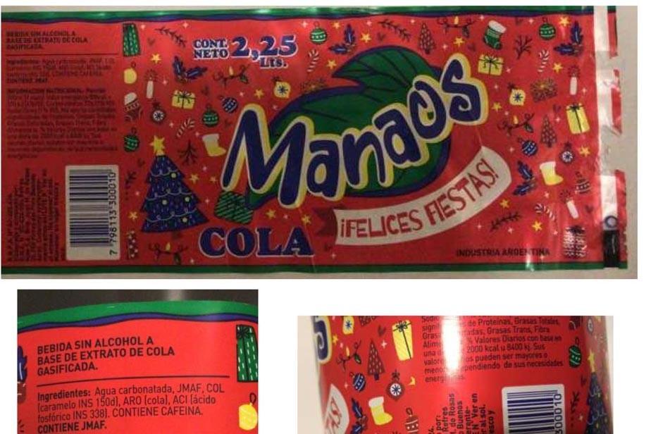 El Ministerio de Salud de Río Negro advierte y recomienda no consumir y denunciar cualquier aparición en el mercado de la bebida sin alcohol, a base de extractos de cola gasificada de 2,25 litros, marca Manaos - Felices Fiestas.